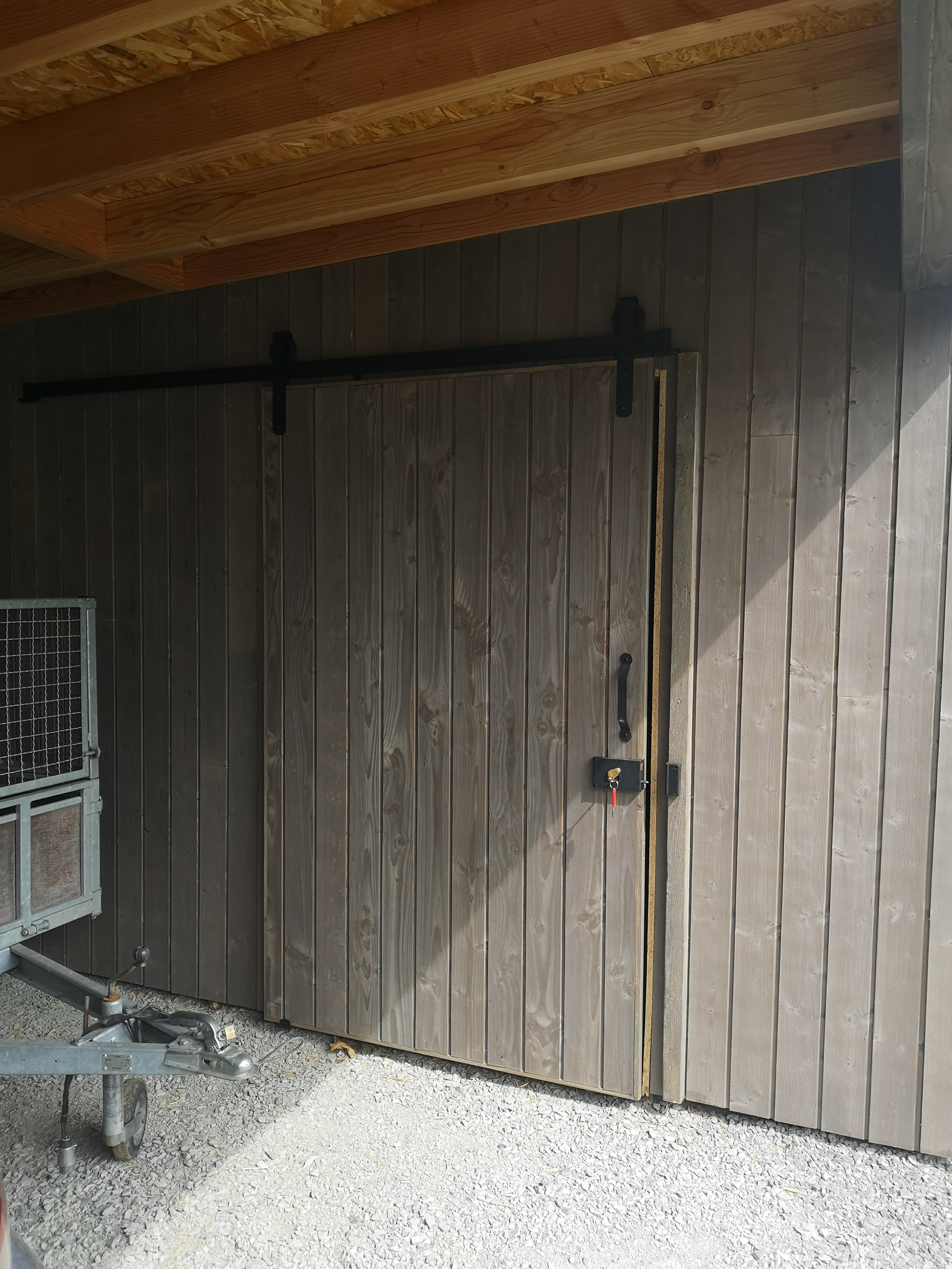 Un joli petit exemple de construction annexe en ossature bois, abritant un carport et un espace clos-couvert de rangement pour le jardin.