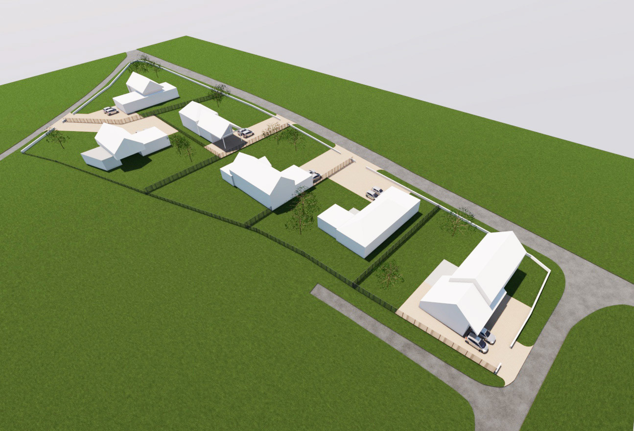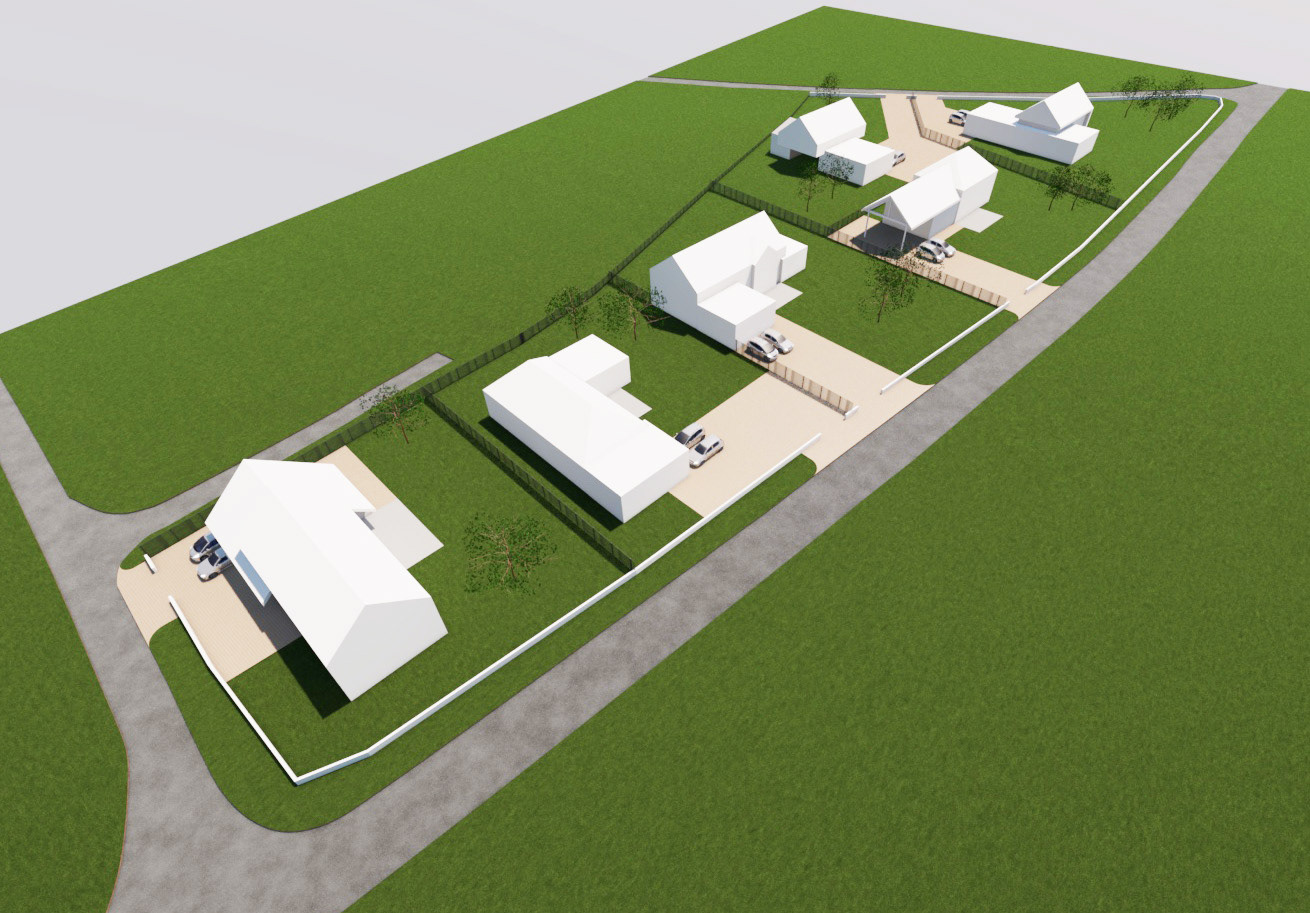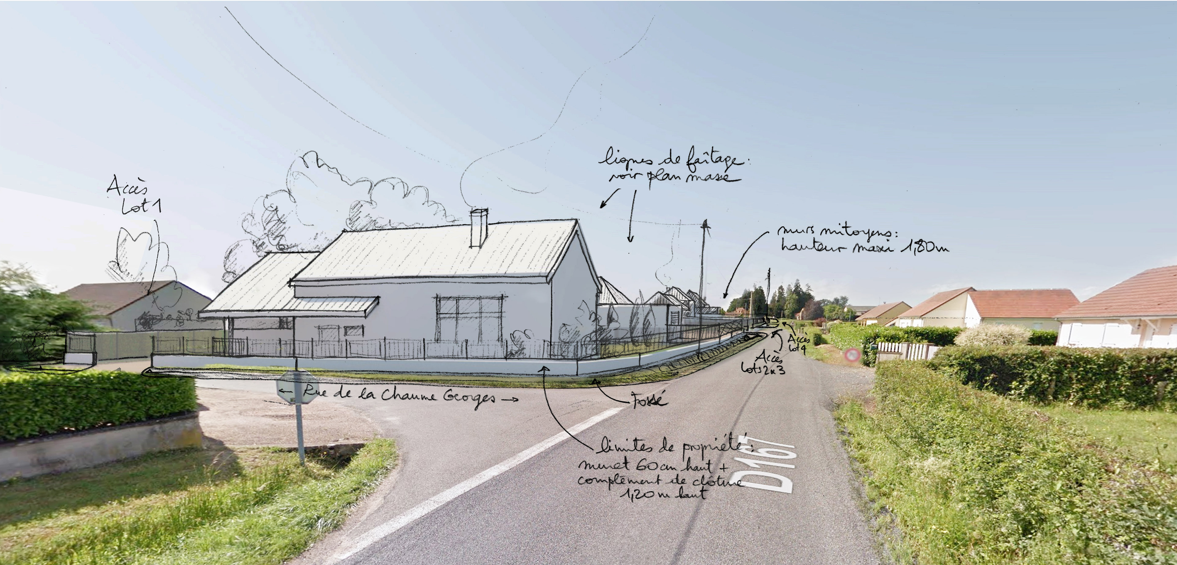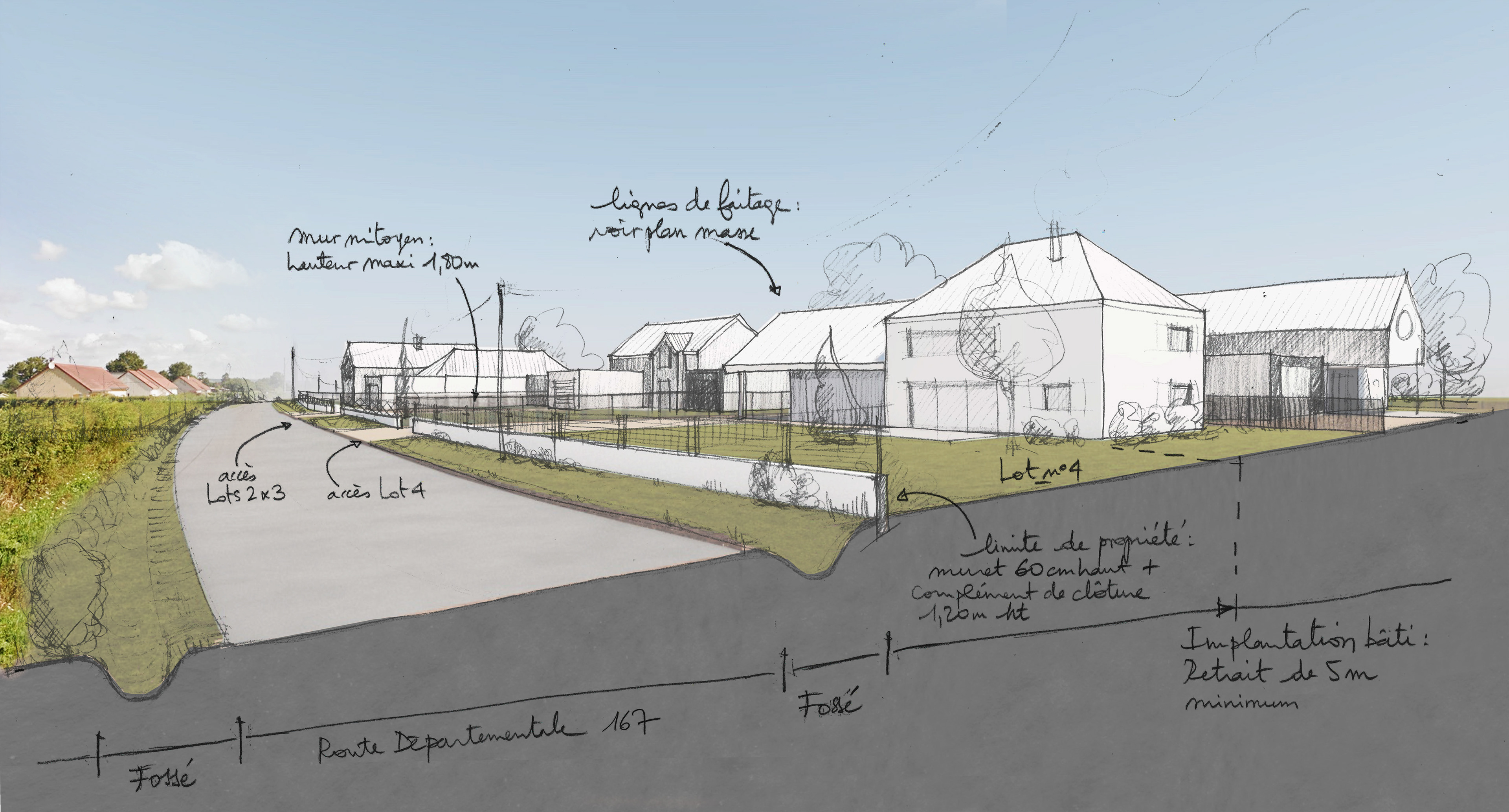 Autre projet en binôme avec ADAGE géomètres concernant la création d'un petit lotissement: implantation des volumes, traitement des clôtures & abords.