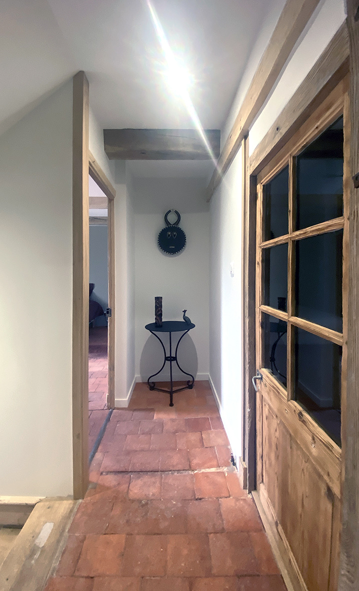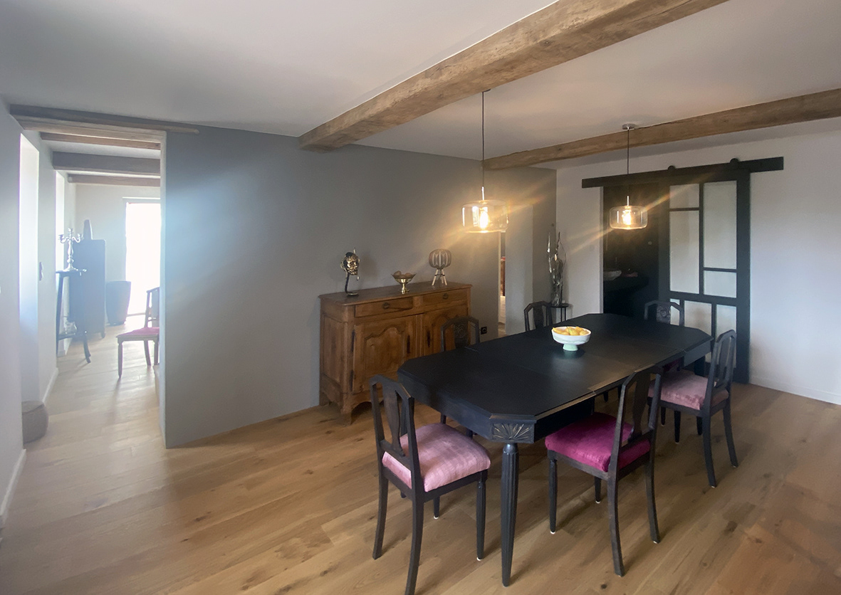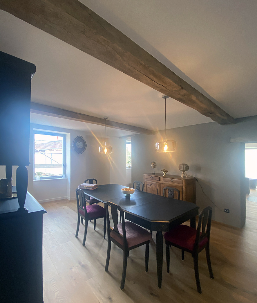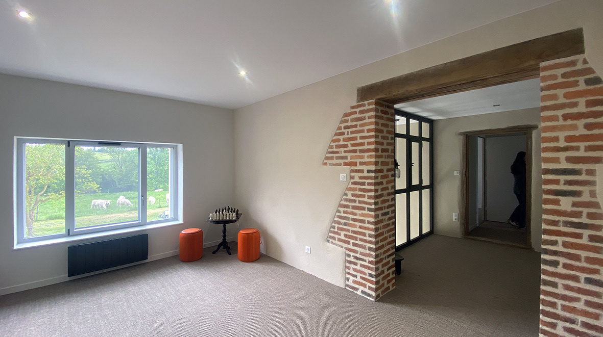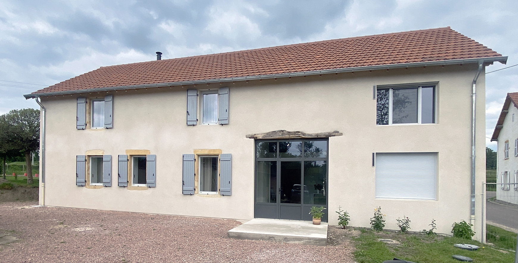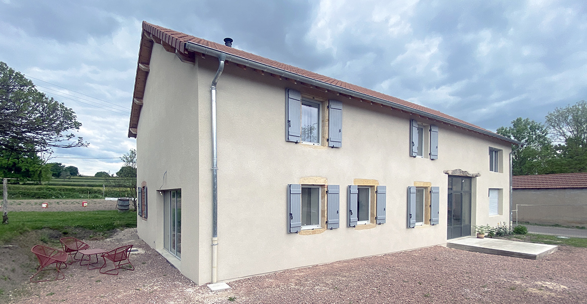 Sandrine a hérité de la maison de campagne de ses parents. Travaillant à l'étranger mais étant attachée à ce bien, elle a fait appel à nous pour en tirer le meilleur : une coquille en matériaux nobles et bruts aménagée selon les règles du bioclimatisme et du respect de la structure : murs en pierre et pisé, charpente et plancher intermédiaire en bois.