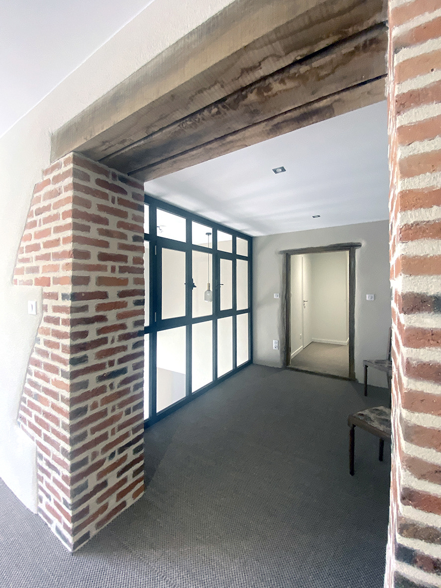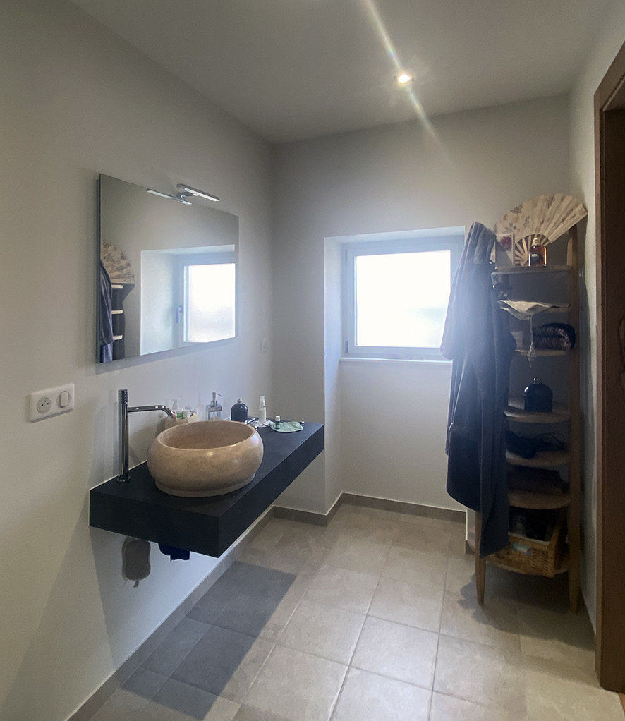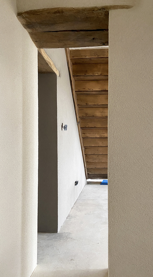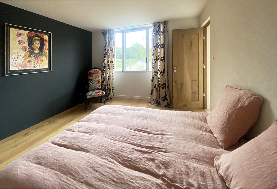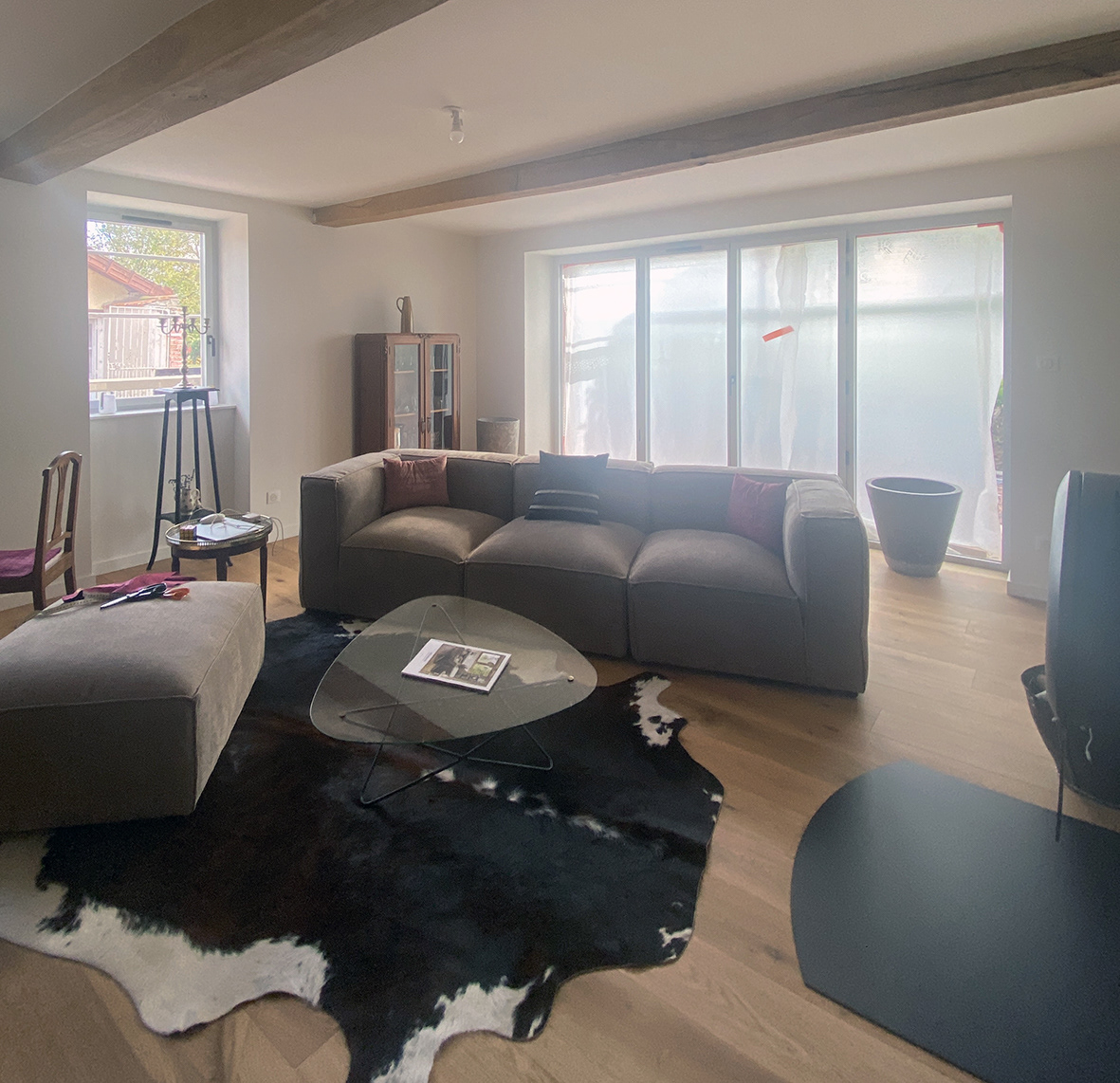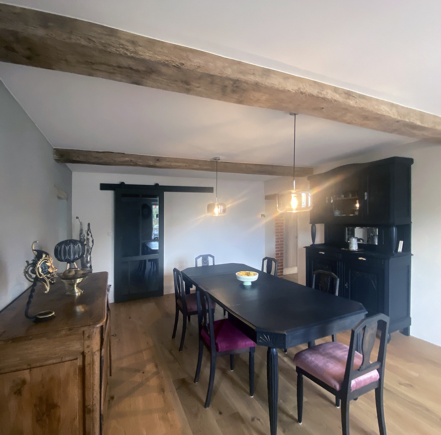 Sandrine a hérité de la maison de campagne de ses parents. Travaillant à l'étranger mais étant attachée à ce bien, elle a fait appel à nous pour en tirer le meilleur : une coquille en matériaux nobles et bruts aménagée selon les règles du bioclimatisme et du respect de la structure : murs en pierre et pisé, charpente et plancher intermédiaire en bois.